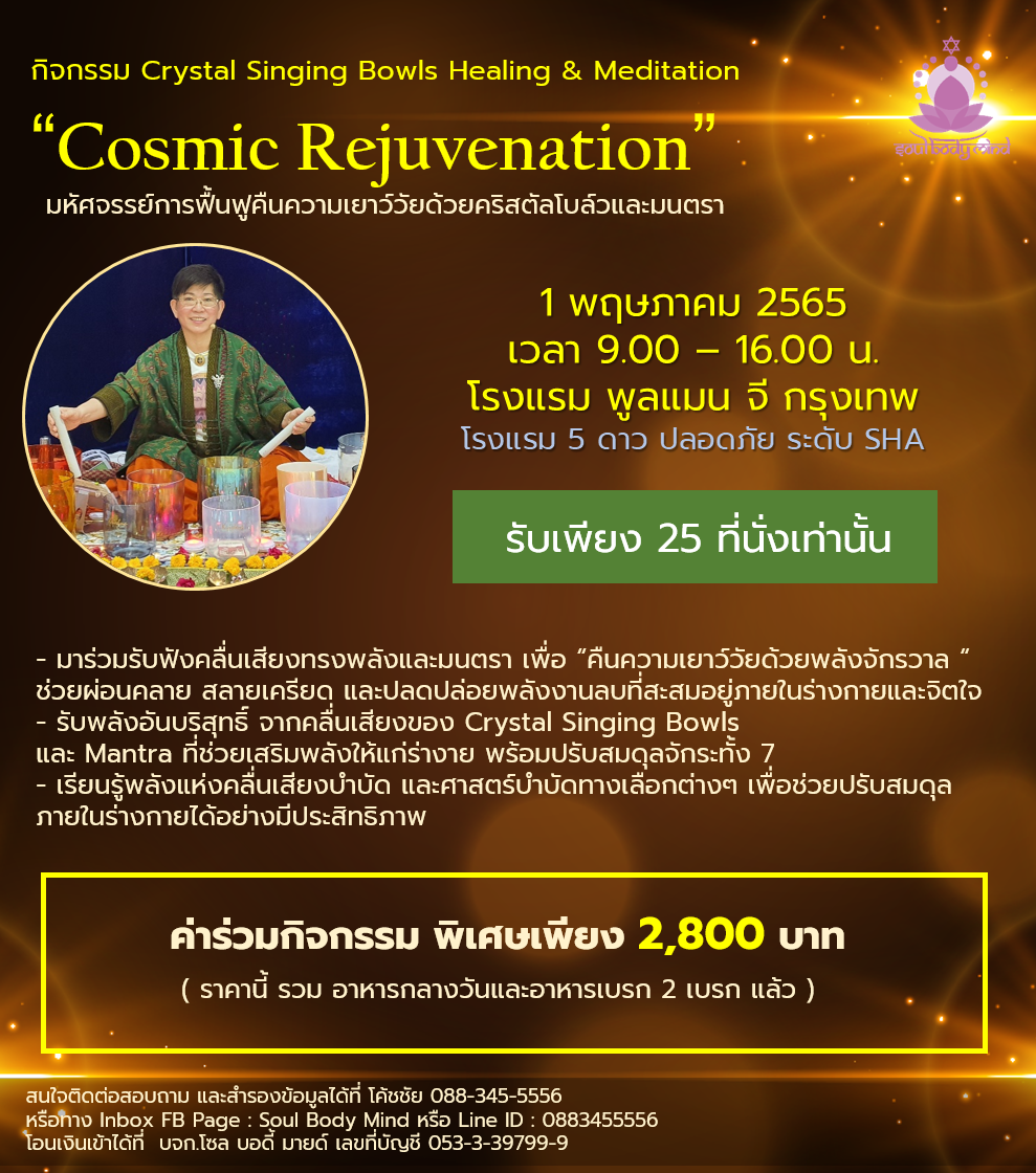 ด้วยการออกแบบหลักสูตรอย่างพิเศษและพิถีพิถัน เอาใจใส่ทุกขั้นตอน กับศาสตร์ที่ทรงพลังที่จะช่วยสร้างเสริมสุขภาพกาย สุขภาพใจ รวมไปถึงด้านจิตวิญญาณ ให้สมดุลอย่างเต็มที่ ในกิจกรรมนี้ จะได้พบกับ คลื่นเสียงอันทรงพลังของ " Crystal Singing Bowl " ที่ผลิตจากวัสดุพิเศษที่ได้สรรสร้างคลื่นเสียงมหัศจรรย์ อันเป็นประโยชน์ต่อร่างกายและจิตใจ ช่วยปรับสมดุลย์ เยียวยา ลดอาการต่างๆ ที่ส่งผลกระทบต่อร่างกายและจิตใจ ให้ดีขึ้นอย่างต่อเนื่อง บวกกับศาตร์องค์รวมต่างๆ ที่จะช่วยสร้างสมดุลย์ภายในให้ดียิ่งขึ้น เกิดการตระหนักรู้ภายใน มีสมาธิมากยิ่งขึ้น และจบคลาสแล้ว ยังสามารถนำเทคนิคต่างๆ ไปใช้ในชีวิตประจำวันได้
